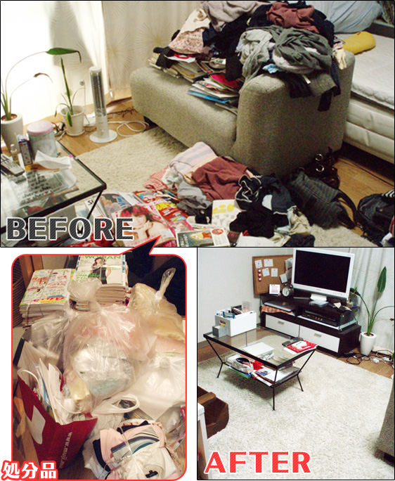 片づけられない、何をやったらよいかわからない、そんな自分に全く自信がなく、その救いを各種自己啓発本、ダイエット本や片付け本、女性向け雑誌類に求めていて、過去何年も溜めてきたそんな本や雑誌の山、散乱した洋服や小物類に囲まれている。